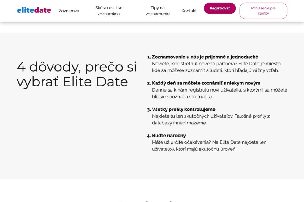 EliteDate kladie dôraz na prísne overovanie svojich používateľov. V dôsledku toho by sa na nej mali objavovať len skutoční ľudia s vážnymi úmyslami.